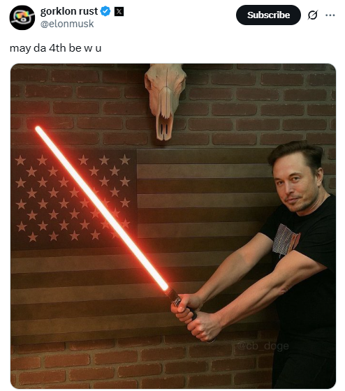 马斯克4月下旬公开暗示,不外,英国《金融时报》报道,马斯克起头“厌倦”!他将从5月起头“大幅”削减办理效率部的时间,美国企业家马斯克同日正在社交上发布了类似气概的图片?两人手持的红色光剑正在片子《星球大和》中代表着反派,美国白宫4日正在社交上发布美国总统特朗普手持光剑的《星球大和》气概AI图片。以及他正在社交称特朗普商业参谋纳瓦罗为“痴人”。巧合的是,5月4日当天,帖文翻译:怎样就没有一个懂行的员工来告诉你们哪种颜色的光剑代表着好、哪种颜色的光剑代表着坏???帖文翻译:从字面上认可他正正在为而和
